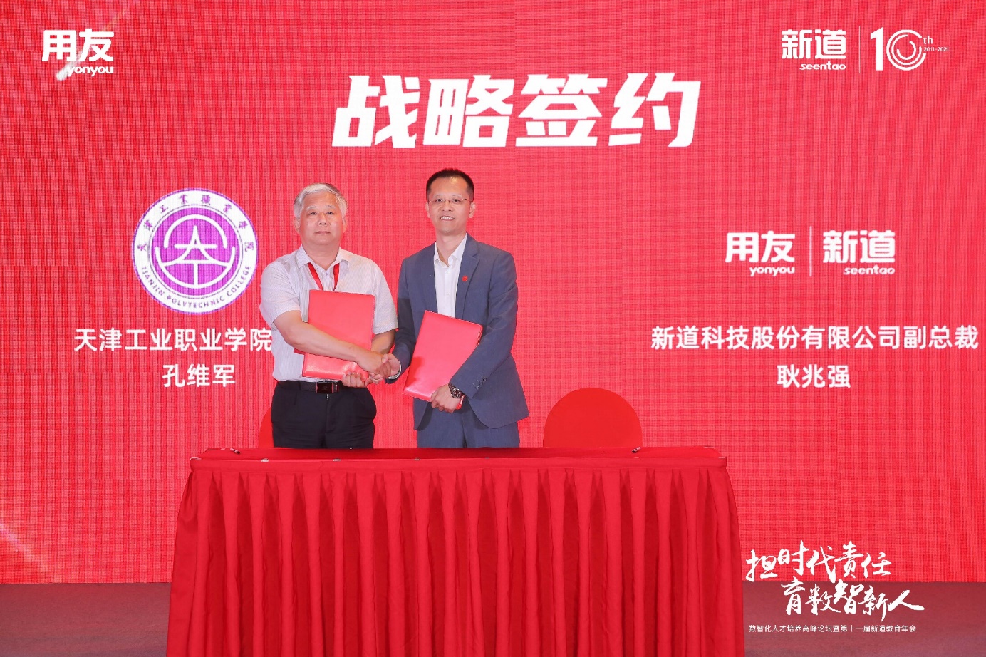 論壇現場,北京理工大學東南信息技術研究院、北京郵電大學、天津工業職業學院、天津中德應用技術大學、貴州電子信息職業技術學院、銅仁職業技術學院與用友新道進行戰略合作簽約,攜手開啟新工科人才培養的新模式。