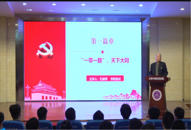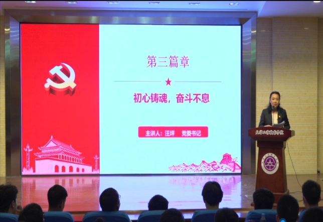 該課程由孔維軍院長和汪坪書記主講,專業課老師作為嘉賓,學生參與,共同上演了一堂精彩紛呈的主題思政課。課程以中國共產黨百年華誕為切入點,展現了工科職業院校特色的思政課改革創新之路。課程從“‘一帶一路’,天下大同”,“實干筑夢,勇擔使命”,“初心鑄魂,奮斗不息”三個方面進行了講授。