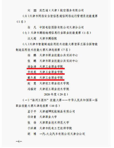近日,天津市人社局授予2018年-2020年天津市市級一類競賽各職業(工種)第一名獲獎者“天津市技術能手”稱號。我院機械工程系謝金濤、李連亮、戴冬晨三名老師以2019年天津市智能制造應用技術技能大賽暨第三屆全國智能制造應用技術技能大賽天津選拔賽第一名的成績獲此稱號。