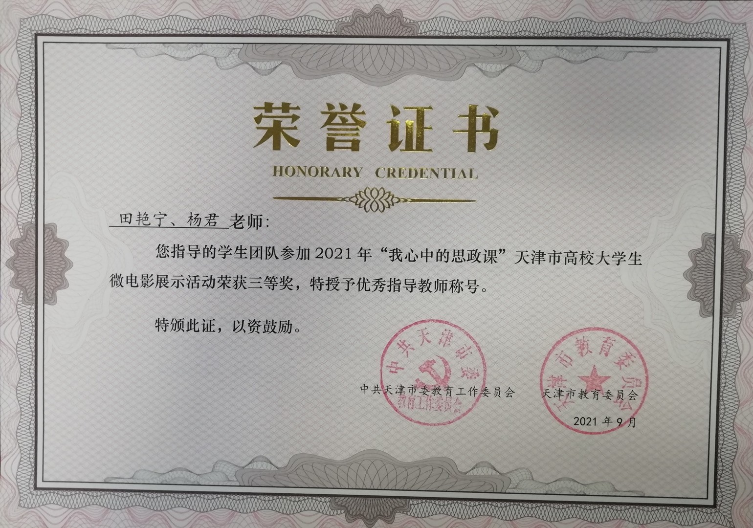 我院思政課部田艷寧、楊君老師指導的學生作品榮獲“我心中的思政課”天津市高校大學生微電影展示活動三等獎。兩位老師被授予優秀指導教師稱號,學院榮獲優秀組織單位獎。據悉,該微電影作品同時被天津市推薦參評全國高校大學生微電影展示大賽。