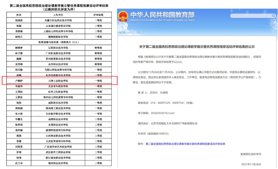 2021年11月26日,教育部“第二屆全國高校思想政治理論課教學展示暨優秀課程觀摩活動”結果揭曉,我院思政課部盧婉婷老師榮獲一等獎。這是我院近年來思政教學競賽方面所取得的最好成績,展現了我院多年來不斷加強思想政治教育工作的顯著成效。