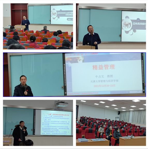 本次培訓特邀天津大學牛占文、潘海生、祝士明三位教授,分別從精益管理方法體系及實踐、精益管理運營原則及案例分析、邁向高技能社會的中國職業技術教育的發展戰略分析、“三教”改革背景下高職院校教育教學改革與發展等方面進行專題講座。培訓深刻闡述了精益化管理是一種經營哲學,是提升學院管理水平,促進學院管理提質增效的有效舉措,其核心是把精益管理思想運用到學院職業教育和管理的全過程。當前世界正經歷百年未有之大變局,我國已經進入高質量發展階段,而職業教育是構建高質量發展的重要支撐。職業教育要堅持以人為核心,實現職業生涯發展的教育。強調技術創新是職業教育標準化的內在邏輯,高職要結合“三教”改革,提升教師教學組織實施能力;促進產教融合,打造命運共同體,整體提升職教治理水平。