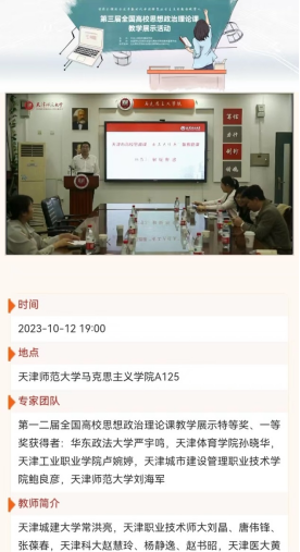 根據《教育部辦公廳關于開展第三屆全國高校思想政治理論課教學展示活動的通知》,經天津市教育兩委學生處批準,全國高校思政課手拉手集體備課中心(天津師范大學-天津市)、全國高校思政課名師工作室(天津師范大學)于2023年10月12 日組織了天津市高校思想政治理論課“云上大練兵”備賽磨課活動和選手答疑指導等活動,并通過全國高校思政課教研系統直播。