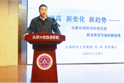 2024年11月29日下午,天津工業職業學院在學院六角報告廳舉辦“新雙高”建設專題培訓會,旨在推動學院“雙高校”建設,提升教師對職業教育發展趨勢的理解。學院黨委副書記、院長楊理連出席并主持會議,學院全體領導班子成員、全體中層干部及各系部全體教師參會,本次會議特邀天津職業大學原校長劉斌教授做主旨報告。