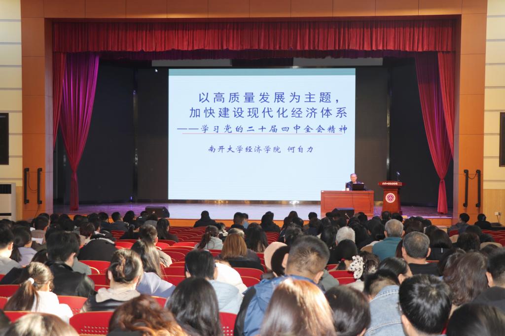 11 月 21 日,天津工業職業學院舉辦“學習貫徹黨的二十屆四中全會精神”專題講座,講座特邀中央馬克思主義理論研究與建設工程專家,南開大學經濟學院教授何自力作深度解讀。學校領導班子成員、全體教職工參加,講座由黨委書記汪坪主持。