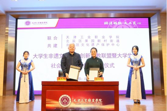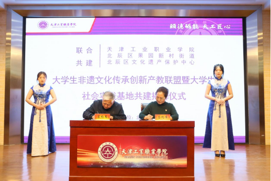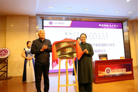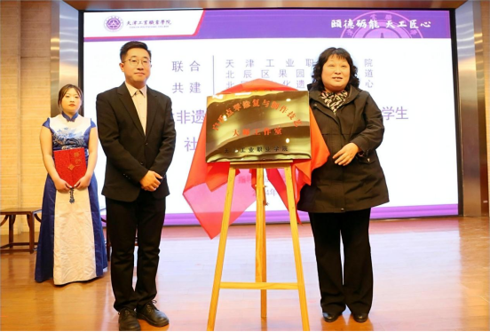 學院院長孔維軍與北辰區文化遺產保護中心主任曹廣鳳,共同簽訂“大學生非遺文化傳承創新產教聯盟”共建協議并為“聯盟”揭牌。
