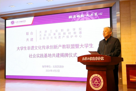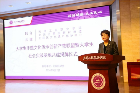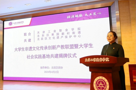 為深入學習貫徹習近平總書記視察天津重要講話精神,堅持以文化人、以文惠民、以文潤城、以文興業,2024年4月2日下午,由學院黨委學生工作部(學生管理部)牽頭舉辦的天津工業職業學院、北辰區果園新村街、北辰區文化遺產保護中心合作共建大學生非遺文化傳承創新產教聯盟暨大學生社會實踐基地簽約揭牌儀式在六角報告廳隆重舉行。北辰區政協副主席王芳、工業職業學院院長孔維軍出席儀式并講話。北辰區政協提案辦公室主任張立海,果園新村街黨工委書記張新宇,果園新村街黨工委副書記、政協聯絡站站長劉楊,工業職業學院副院長張秀芳,北辰區文化遺產保護中心主任曹廣鳳及北辰區政協委員代表,學院黨委學生工作部、教務部、招生就業指導辦公室、思政課部相關負責同志,學院五系黨支部副書記,師生代表出席儀式。