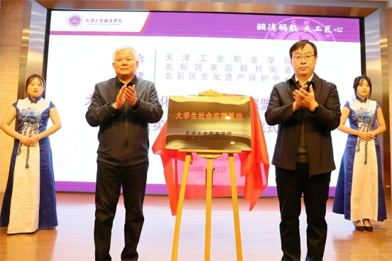 共建儀式上,學院院長孔維軍與果園新村街黨工委書記張新宇,為天津工業職業學院“大學生社會實踐基地”揭牌。