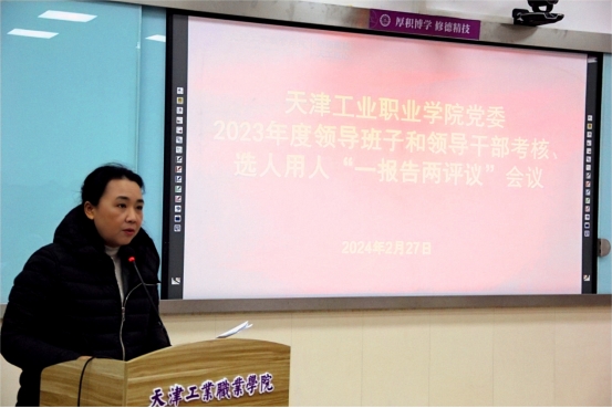 2月27日,天津工業職業學院黨委召開2023年度領導班子和領導干部考核、干部選拔任用“一報告兩評議”會議,會議由黨委書記汪坪主持,市教育兩委干部處田青宇處長、高彬副處長以及相關同志到會指導,學院領導班子成員、全體中層干部及基層黨員群眾代表參加會議。
